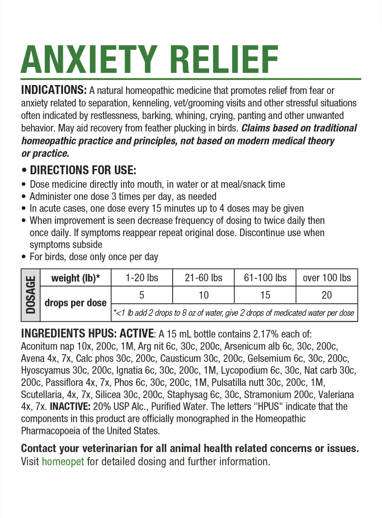 Whether your pet is a puppy, kitten, senior, or small companion like a ferret or hamster, HomeoPet ANXIETY RELIEF is safe for all life stages and may help provide natural relief from the symptoms of anxiety such as restlessness, barking, whining, crying, panting, or other unwanted behaviors including feather plucking in birds.