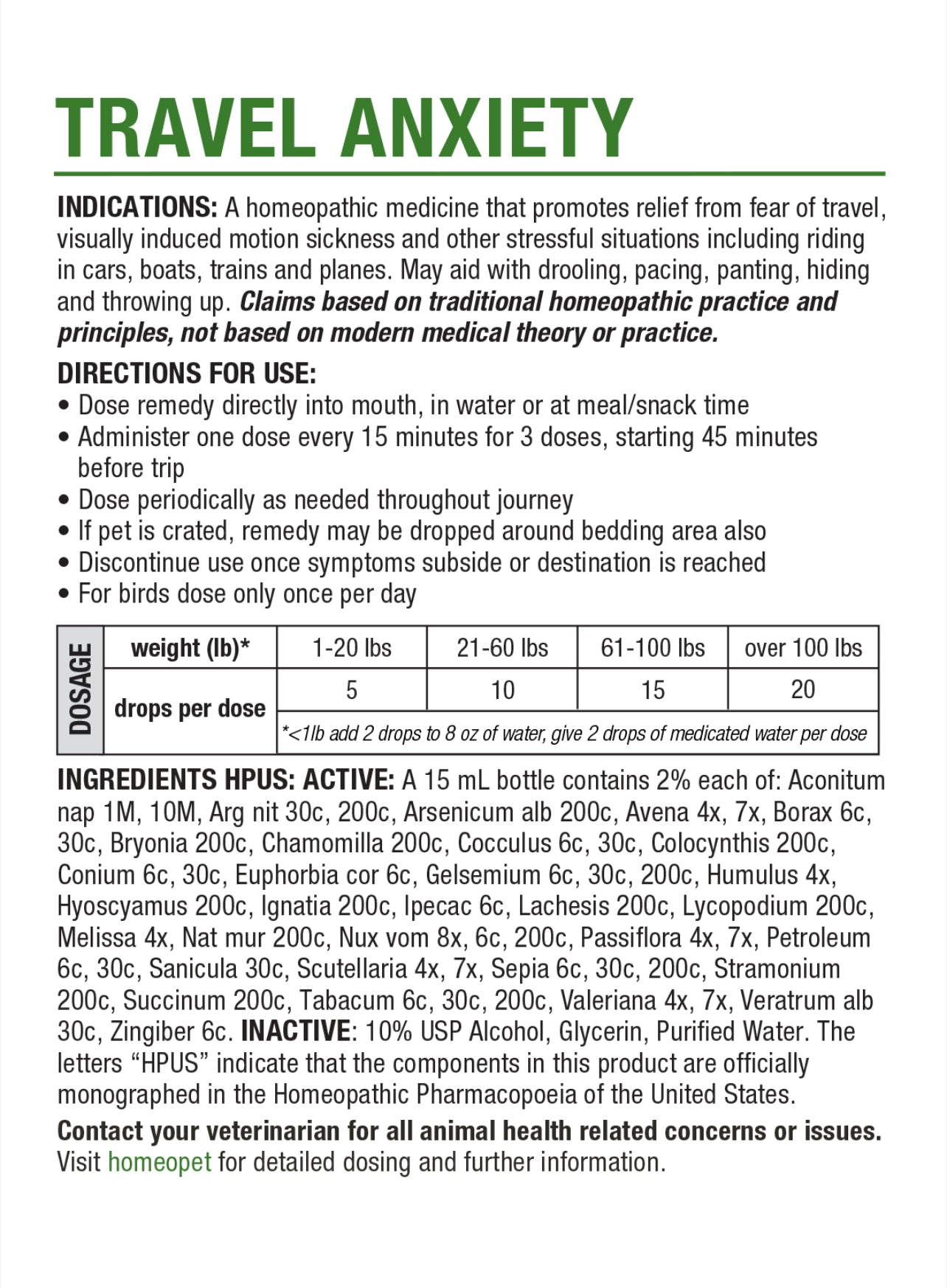 HomeoPet TRAVEL ANXIETY is an easy-to-dose liquid remedy that may help to address common signs of pet travel anxiety including panting, drooling, pacing, hiding, and stress-induced motion sickness or vomiting. Whether you’re planning a vacation, moving homes, or heading to the vet, this natural remedy may help make transportation less stressful for your furry friend.