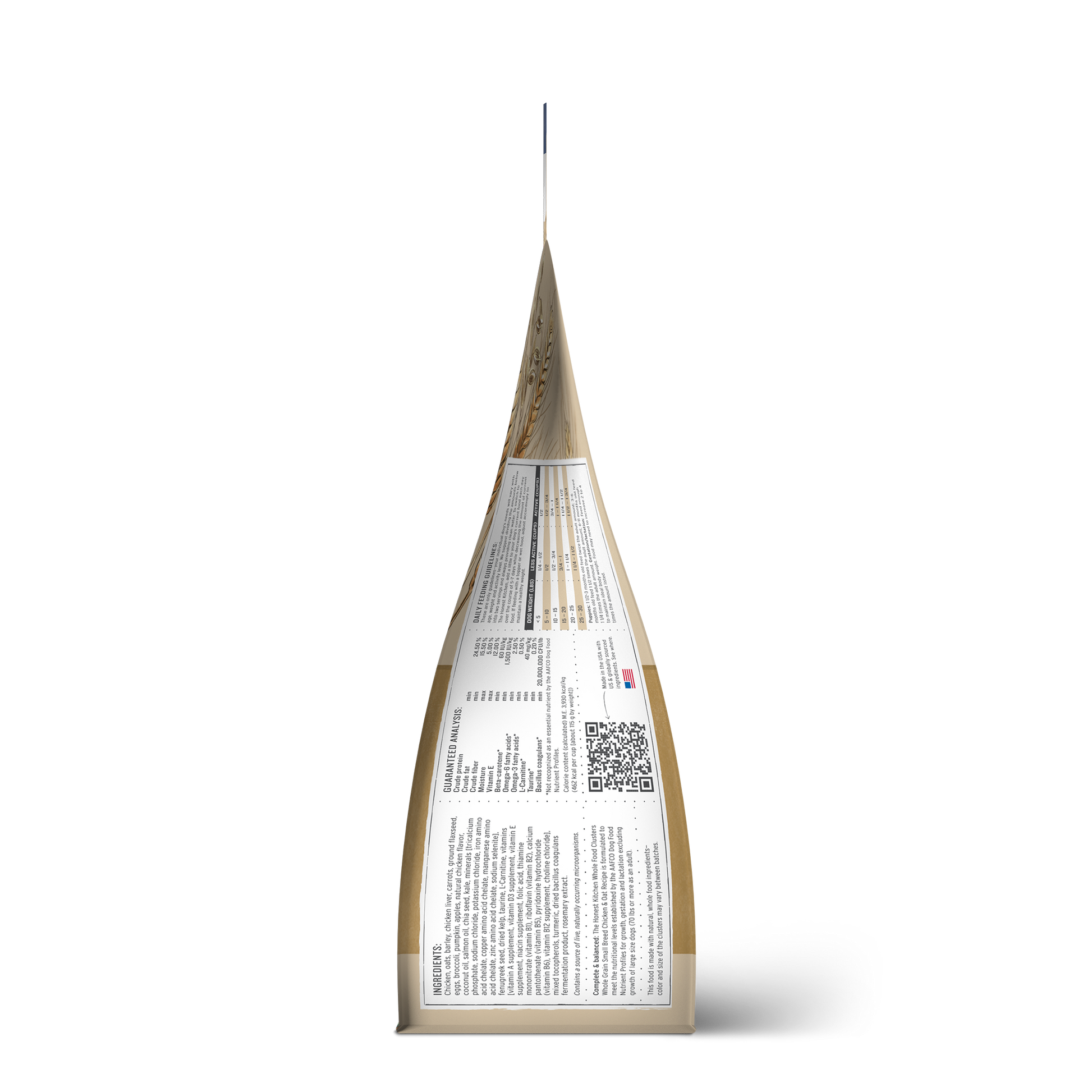 Chicken, oats, barley, chicken liver, carrots, ground flaxseed, eggs, broccoli, pumpkin, apples, natural chicken flavor, coconut oil, salmon oil, chia seed, kale, minerals [tricalcium phosphate, sodium chloride, potassium chloride, iron amino acid chelate, copper amino acid chelate, manganese amino acid chelate, zinc amino acid chelate, sodium selenite], fenugreek seed, dried kelp, taurine, L-carnitine, vitamins [vitamin A supplement, vitamin D3 supplement, vitamin E supplement, niacin supplement, folic acid, thiamine mononitrate (vitamin B1), riboflavin (vitamin B2), calcium pantothenate (vitamin B5), pyridoxine hydrochloride (vitamin B6), vitamin B12 supplement, choline chloride)], mixed tocopherols (a natural preservative), turmeric, dried bacillus coagulans fermentation product, rosemary extract.